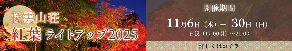 松雲山荘は、大正15年以降に市内東本町蓮池庭師2代の手によって造園された名園で、昭和46年に飯塚謙三氏から市へ譲渡されました。 情緒あふれる日本庭園は、赤松、つつじ、もみじなど多数の樹木に覆われ、灯籠、太鼓橋、東屋、池などを配しています。 秋には、約300本のモミジやドウダンツツジの垣根が色づき、訪れる人の目を奪います。 毎年10月下旬~下旬には紅葉ライトアップも行われ、昼間とは違った幻想的な雰囲気を楽しむことができます。 また、園内にある茶道専門の木村茶道美術館では、収蔵品である国宝級の茶器でお茶を味わうことができます。 屋外茶席で秋の風情を感じながら紅葉とお茶を楽しむのもおすすめです。