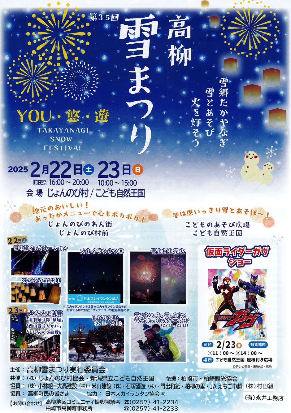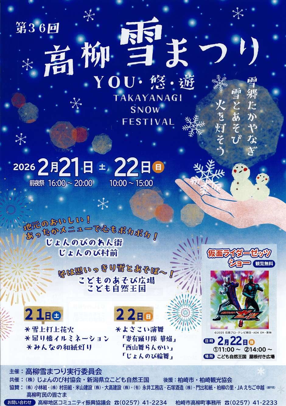 「辛い雪国の生活の中で、雪を楽しもう」と始まった高柳町の雪祭りがYOU(あなたも)・悠(のんびり)・遊(楽しもう)です。前夜祭と本祭の2日間にわたり開催されます。