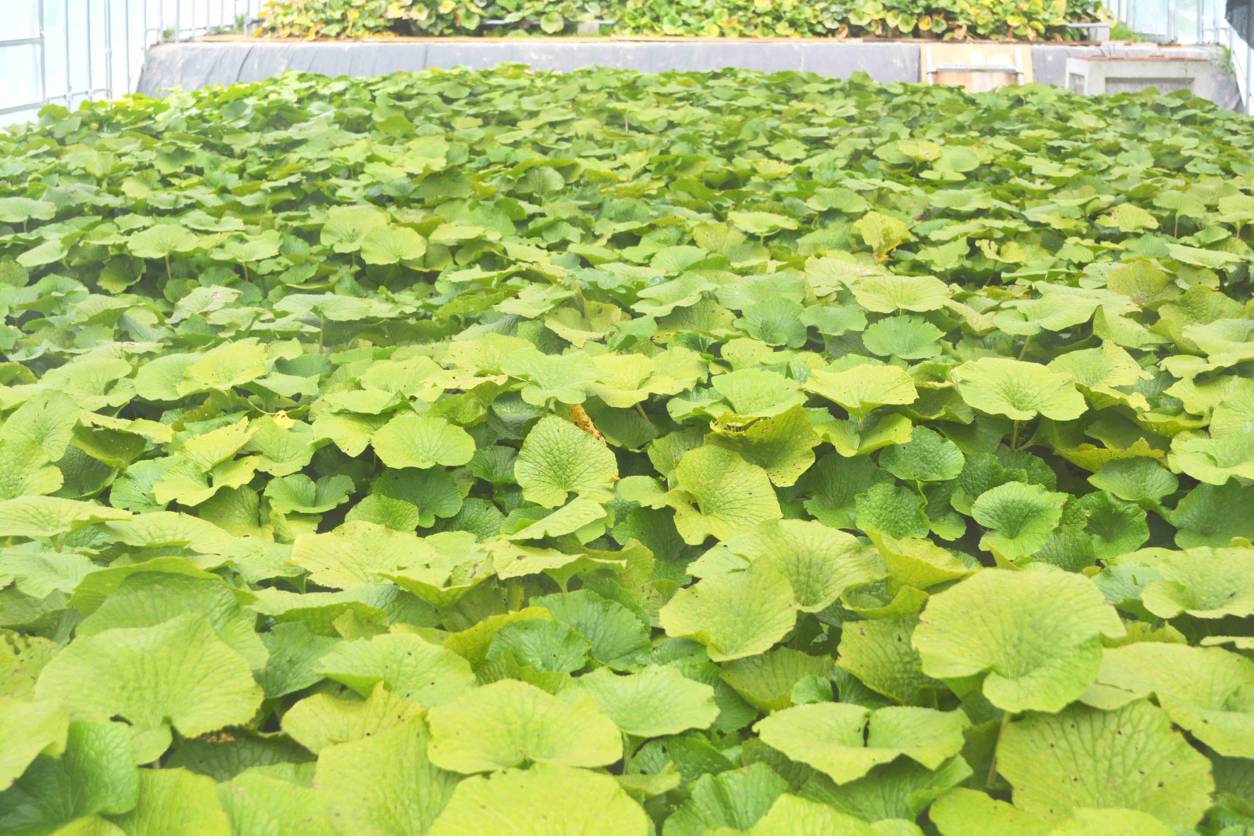 園内の栽培ハウスは見学も自由。青々と茂るわさびの群生を見ると、ここが海の近くだということを忘れてしまいます。わさびは海水に弱いため、風除けやビニールハウスでしっかりと潮風から守っているんです。