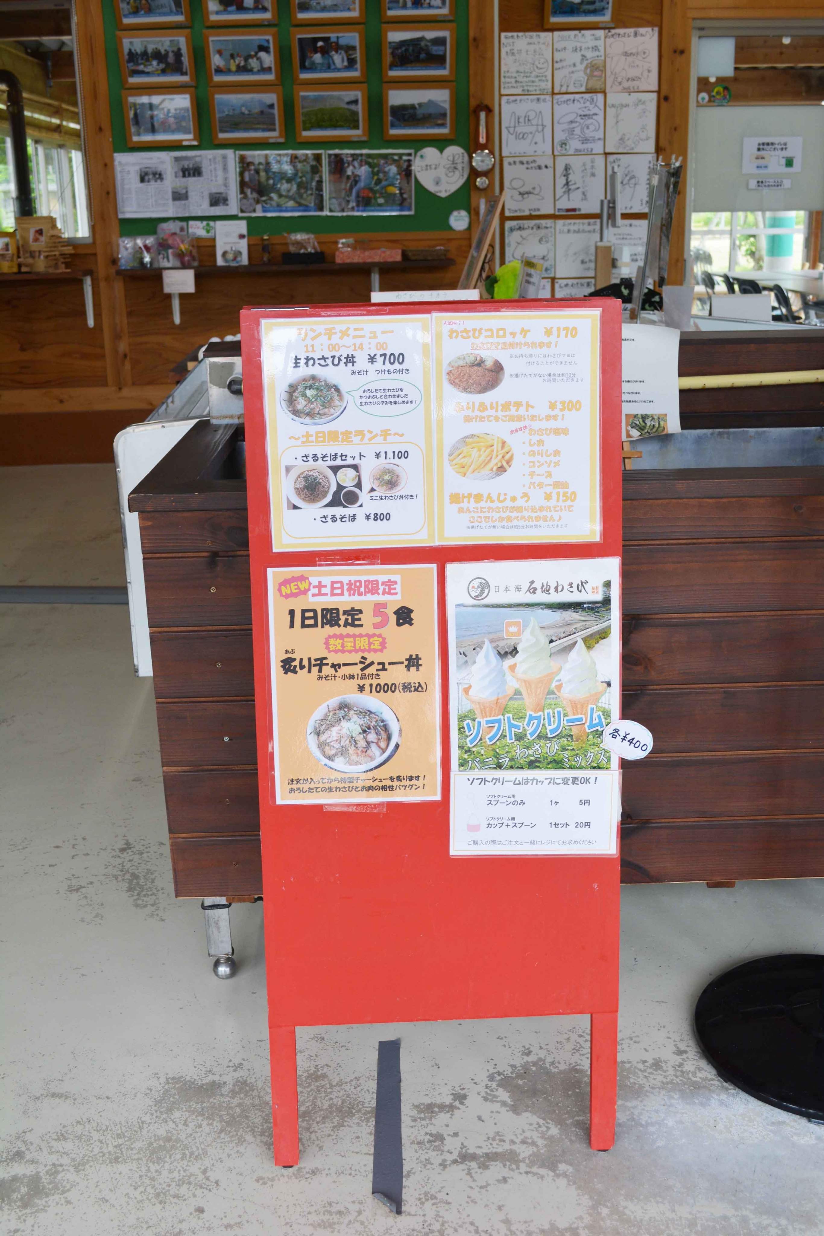 直売所では収穫された新鮮なわさび、わさびを使った商品やグッズがずらりと並んでいます。こちらでぜひ食べてみてほしいのが「わさびソフト」と「生わさび丼」、そして「わさびコロッケ」!
