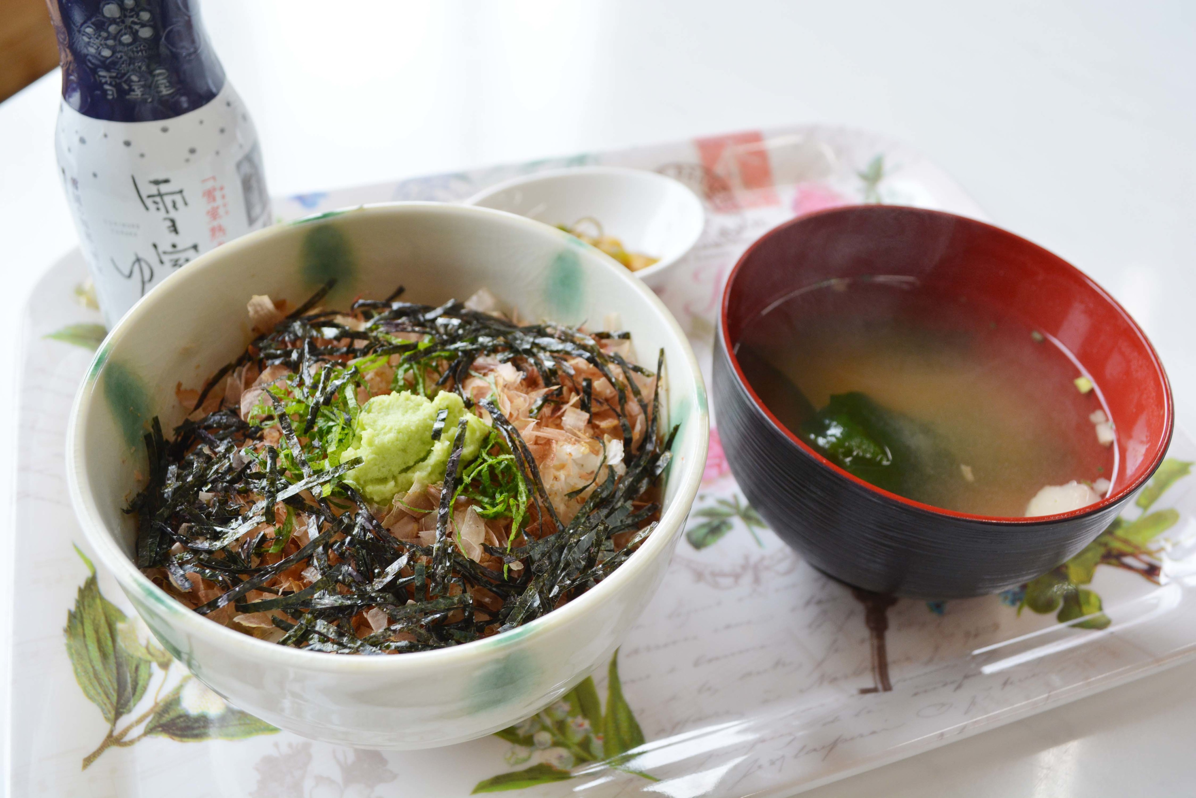 生わさび丼は、おろしたての生わさびをのせた、熱々のご飯にかつお節と刻みのりをトッピング。お醤油をかけて、わさびをまぶしながら食べるのが筆者のお気に入り。一度にほおばるとむせちゃうのでわさびを少しずつまぶしながら味わってくださいね。