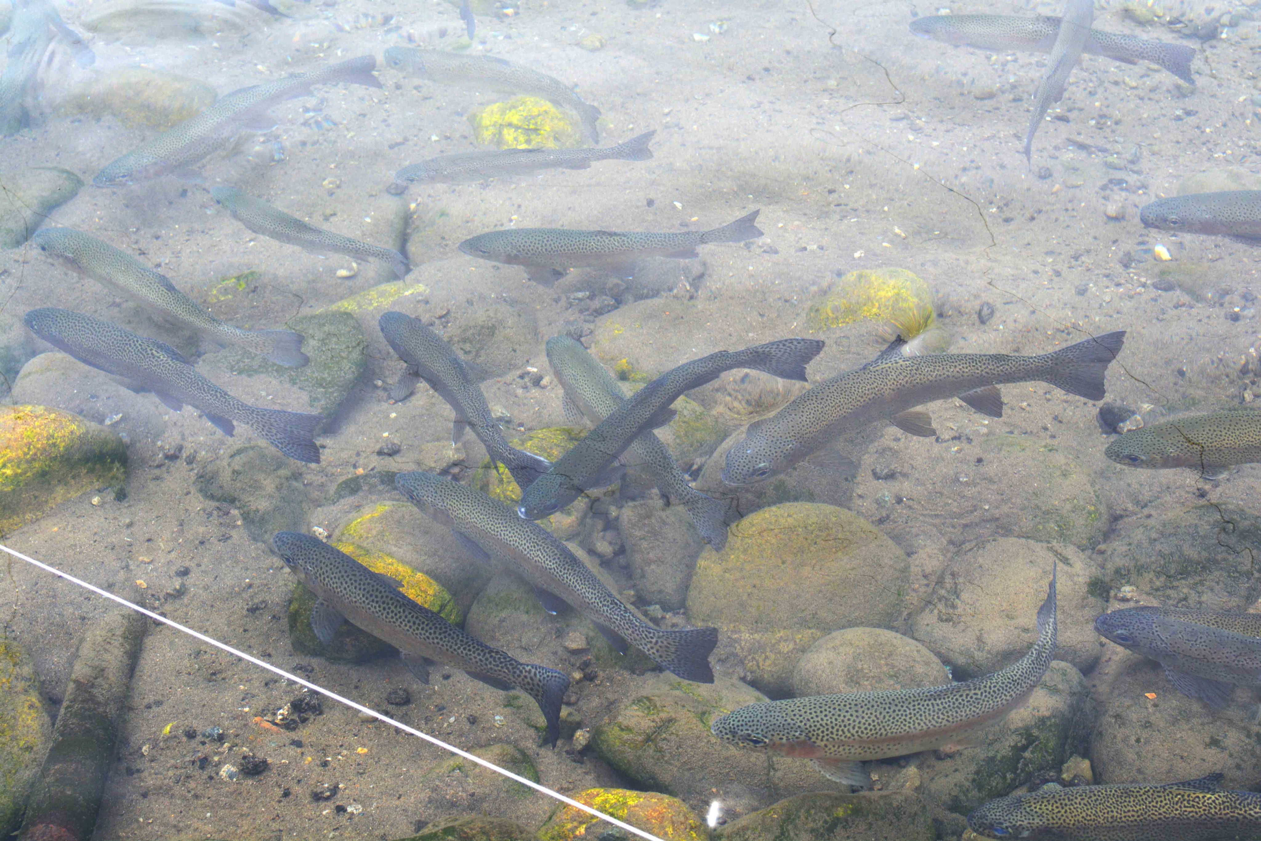 海のすぐ近くなのにわさび園?と思われる方も多いはず。わさび、というと長野県や静岡県など、清流の流れるところで育つイメージですよね。石地わさび園では、地下を流れる豊富な天然水をポンプでくみ上げて、わさびを育てています。年間を通して14度の水温を保つミネラルたっぷりの水はわさびの栽培ハウスを潤し、園内を流れて釣り堀で泳ぐニジマスも育てているんですよ。