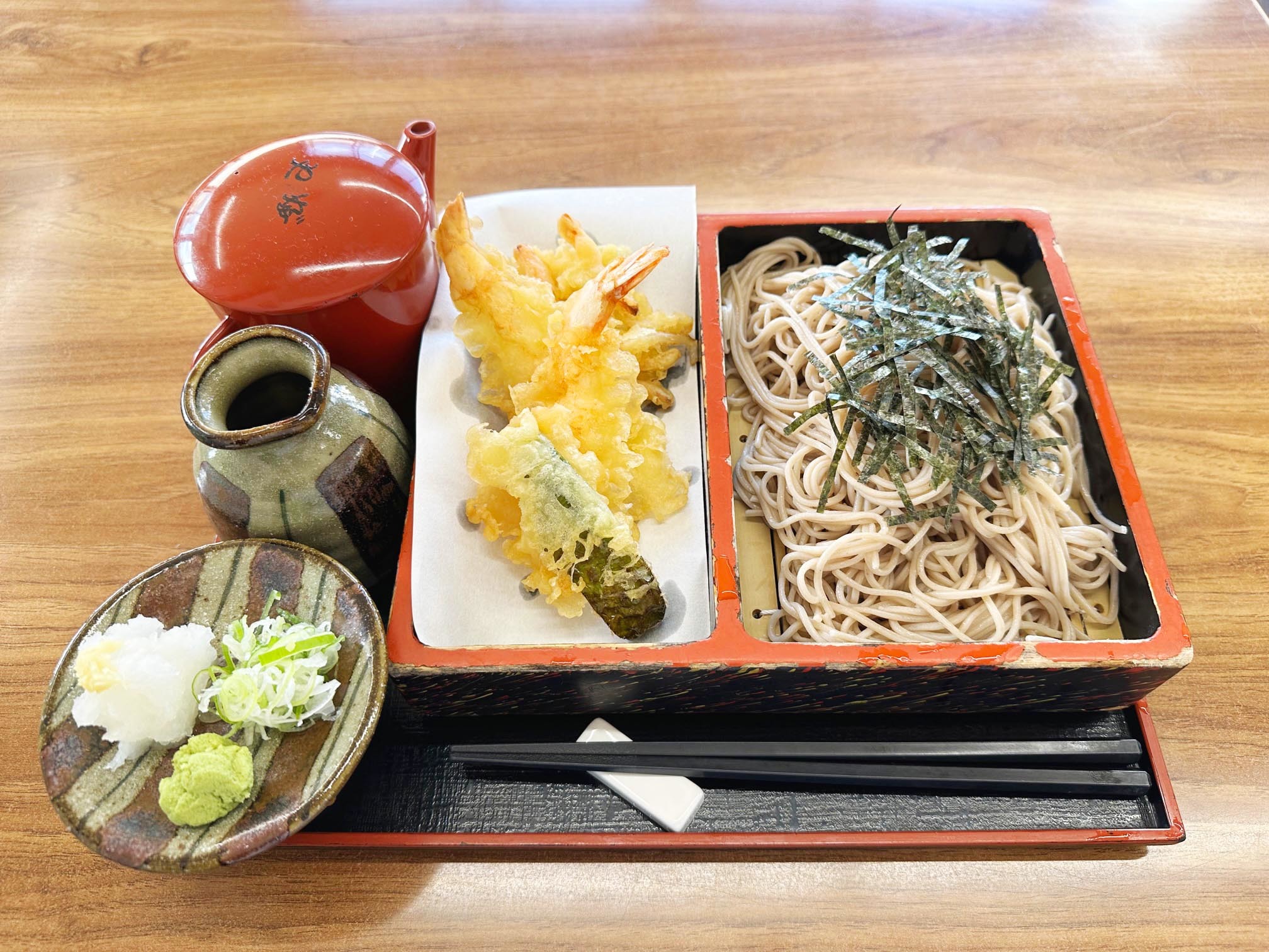 創業70余年の「生蕎麦やぶ」さん。布海苔をつなぎにした自家製の蕎麦は、つるつるとしたのど越しと食感が身上です。3カ月ほどねかせたかえしに鰹節やサバ節などの出汁を合わせたつゆが布海苔入りの蕎麦によく合います。カリっと揚がった天ぷらもおすすめです。