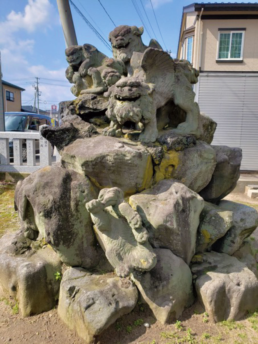 《獅子は千尋の谷に我が子を落とす》との故事を具現化したものだが、東京で流行った物とは全然違う。先ずベースとなる狛犬が、柏崎を始め、北前船の寄港地に見られる出雲型。親獅子を“座型の子取り”と“構え獅子型”で作り上げ、五匹もの子獅子を加えて構成されている。これだけでも普通ではないのに、更に全てに大きな翼が生えているのだ。