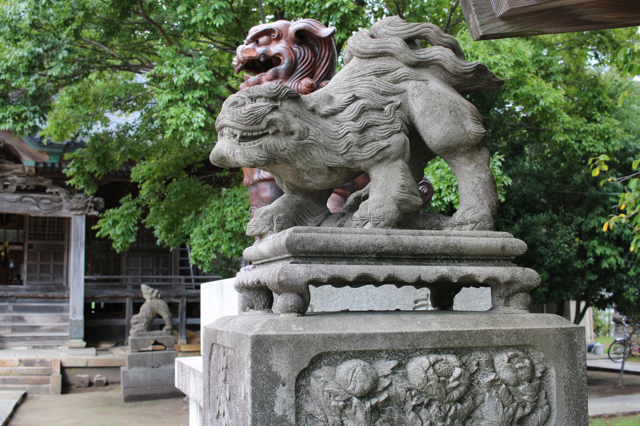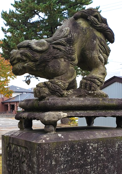 三対の狛犬のうち、一番社殿寄りが北前船で運ばれた構え獅子。手前が由廣の狛犬だ。