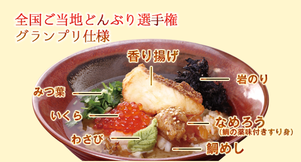 ・グランプリ仕様2,500円(税別) (お造り・親子漬・デザート付) ・オリジナル 3,000円(税別) (鯛の山かけ・親子漬・小鉢・デザート付) |